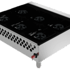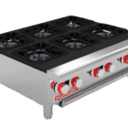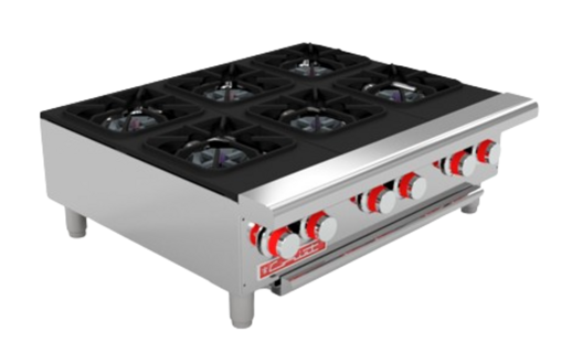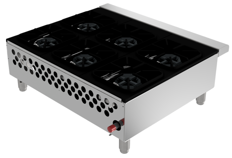 6 quemadores octagonales sólidos de hierro fundido, con una potencia de 24,000 BTU/h por quemador, para cocción rápida y uniforme.