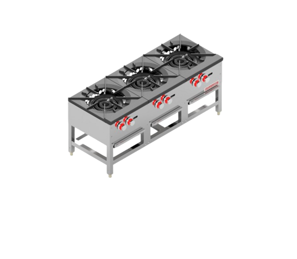 3 quemadores de alta potencia en hierro fundido de 70,000 BTU/h cada uno, ideales para preparación de alimentos a gran escala.